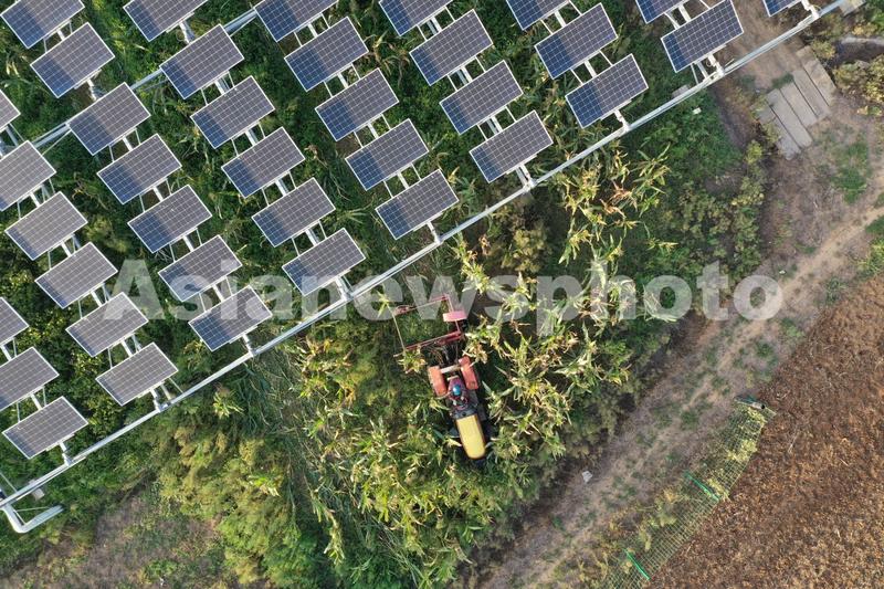 图片说明:9月5日,湖北宜城市王集镇观音村500余亩“农光互补”光伏电站的光伏板下,农户在收割青储饲料。