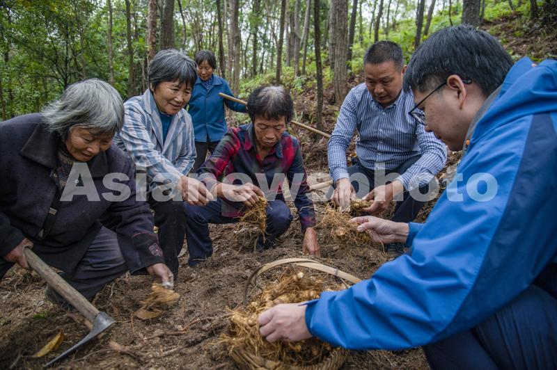 2022年10月28日,浙江省金华市磐安县新渥街道山干村中药材种植基地内,工人们忙着翻地、施肥,栽种中药材黄精。
