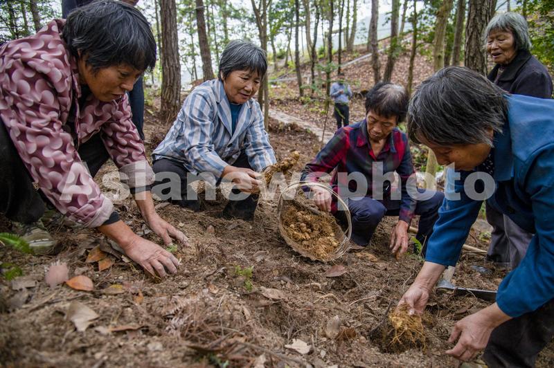 2022年10月28日,浙江省金华市磐安县新渥街道山干村中药材种植基地内,工人们忙着翻地、施肥,栽种中药材黄精。