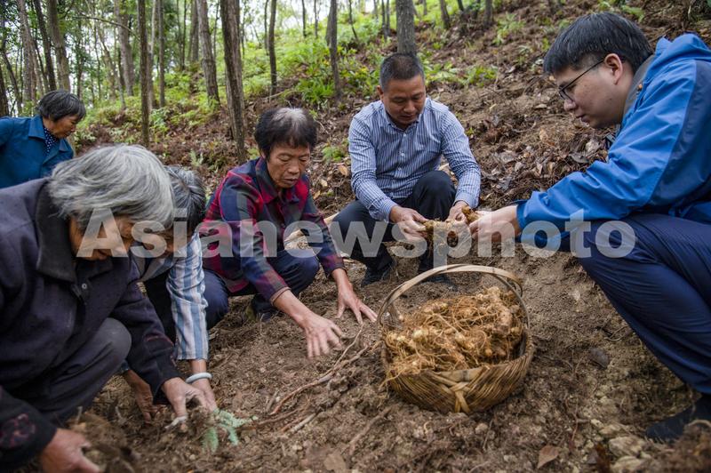 2022年10月28日,浙江省金华市磐安县新渥街道山干村中药材种植基地内,工人们忙着翻地、施肥,栽种中药材黄精。
