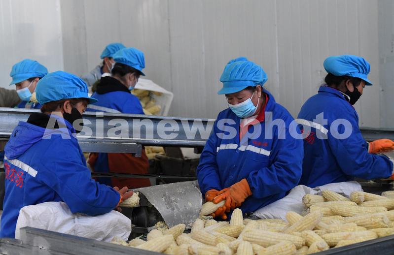 图片说明:2022年10月29日,在河北省张家口市涿鹿县大堡镇青杨树玉米加工厂,农民在鲜食玉米加工生产线上工作。