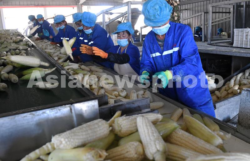 图片说明:2022年10月29日,在河北省张家口市涿鹿县大堡镇青杨树玉米加工厂,农民在鲜食玉米加工生产线上工作。
