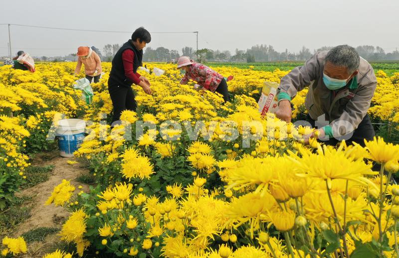 2022年10月30日,安徽省亳州市谯城区牛集镇韩高楼村的菊农在田间采摘金丝黄菊。近年来,安徽省亳州市坚持党建引领,采取“合作社+基地+农户”的种植模式,引导农民大力发展菊花等中药材种植,把菊花加工成花茶、饮料等高附加值产品,实现农业增效,农民增收。