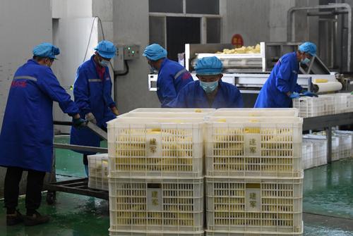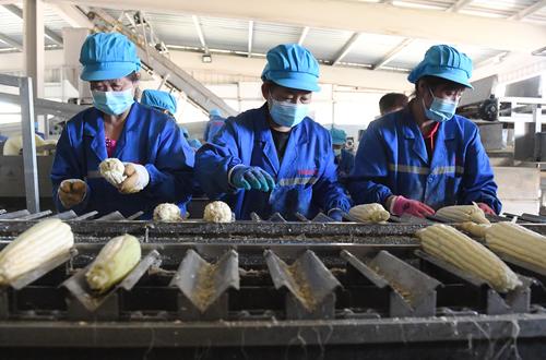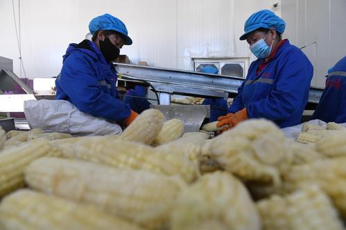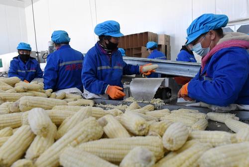 图片说明:2022年10月29日,在河北省张家口市涿鹿县大堡镇青杨树玉米加工厂,农民在鲜食玉米加工生产线上工作。