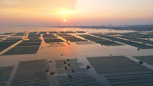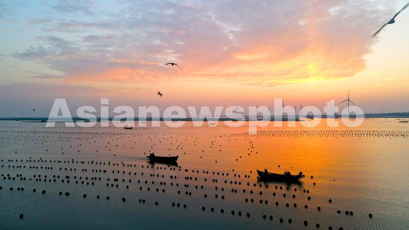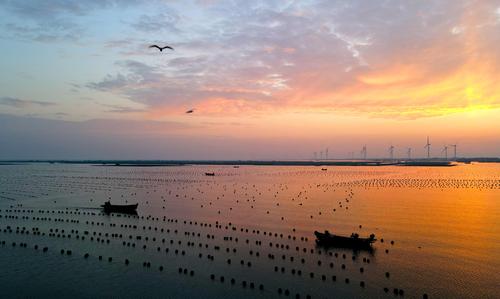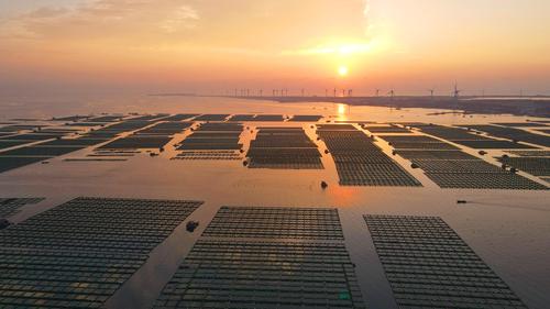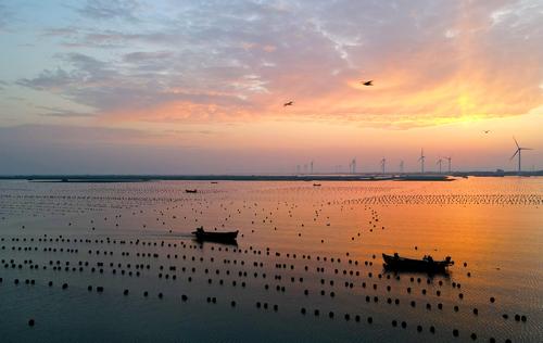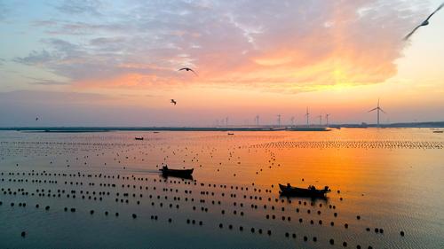 2022年10月30日,深秋时节,霞光普照,山东省荣成市各个海洋牧场到处呈现繁忙的生产景象。产业工人身披朝霞,驾驶舢板在海上穿梭,向养殖网箱投喂饵料,清理养殖筏架敷草,纠正养殖浮漂等作业,呈现出一派海上晨耕生产景象。