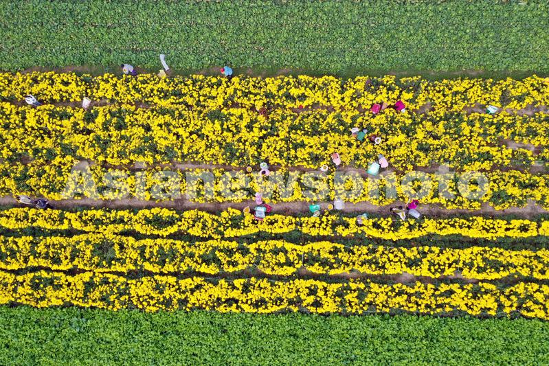 2022年10月30日,安徽省亳州市谯城区牛集镇韩高楼村的菊农在田间采摘金丝黄菊。近年来,安徽省亳州市坚持党建引领,采取“合作社+基地+农户”的种植模式,引导农民大力发展菊花等中药材种植,把菊花加工成花茶、饮料等高附加值产品,实现农业增效,农民增收。