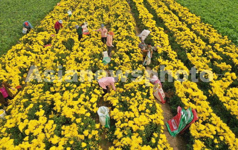 2022年10月30日,安徽省亳州市谯城区牛集镇韩高楼村的菊农在田间采摘金丝黄菊。近年来,安徽省亳州市坚持党建引领,采取“合作社+基地+农户”的种植模式,引导农民大力发展菊花等中药材种植,把菊花加工成花茶、饮料等高附加值产品,实现农业增效,农民增收。