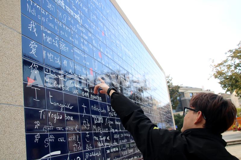 图片说明:2022年10月31日,市民在江苏苏州工业园区李公堤文创街区的法国《爱墙》旁观赏和拍照留念。