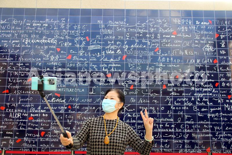 图片说明:2022年10月31日,市民在江苏苏州工业园区李公堤文创街区的法国《爱墙》旁观赏和拍照留念。