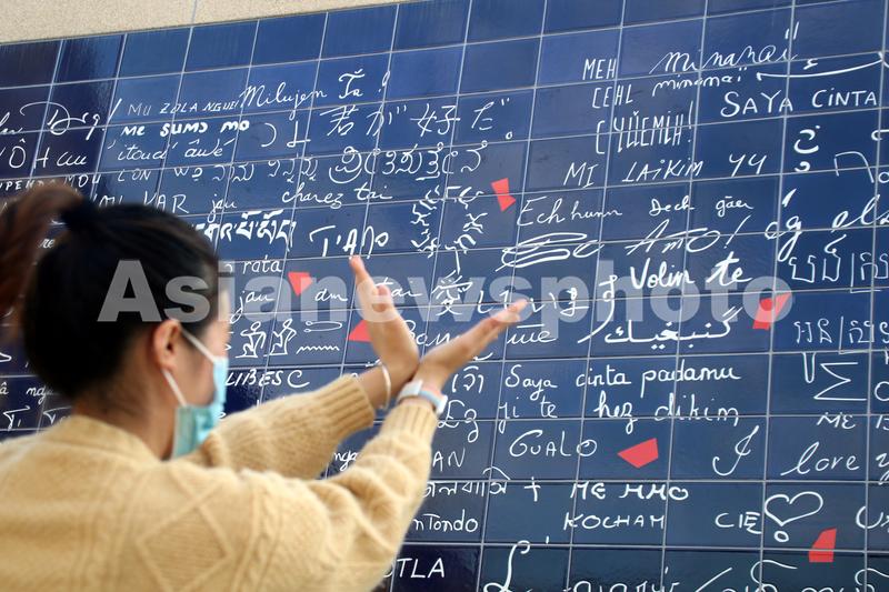 图片说明:2022年10月31日,市民在江苏苏州工业园区李公堤文创街区的法国《爱墙》旁观赏和拍照留念。