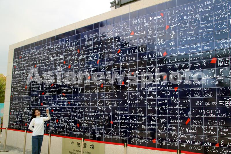 图片说明:2022年10月31日,市民在江苏苏州工业园区李公堤文创街区的法国《爱墙》旁观赏和拍照留念。