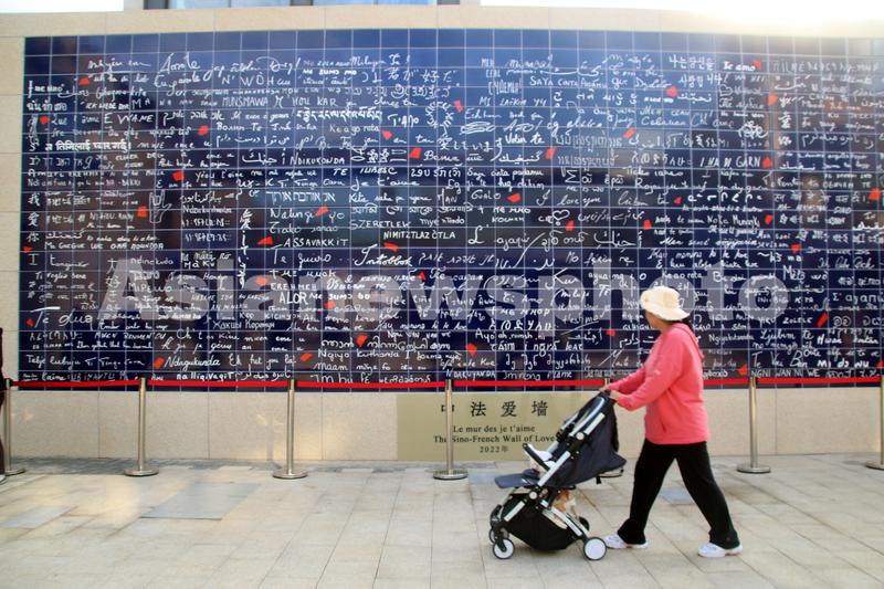 图片说明:2022年10月31日,市民在江苏苏州工业园区李公堤文创街区的法国《爱墙》旁观赏和拍照留念。