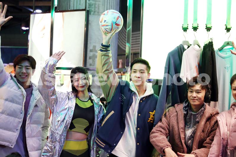2022年10月29日,上海,阿迪达斯(adidas)旗舰店内时尚模特手持卡塔尔世界杯足球搭配各种服装走秀。