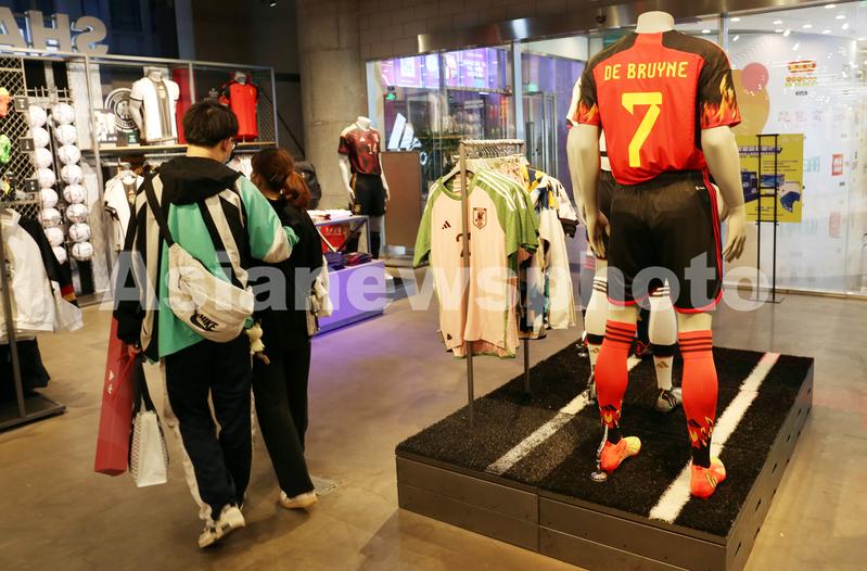 2022年10月29日,上海,卡塔尔世界杯官方球衣亮相阿迪达斯(adidas)旗舰店,图为比利时国家队球星德布劳内的球衣。