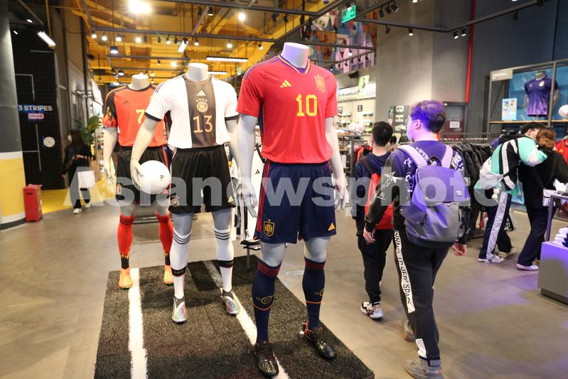 2022年10月29日,上海,卡塔尔世界杯官方球衣和足球亮相阿迪达斯(adidas)南京路步行街旗舰店。