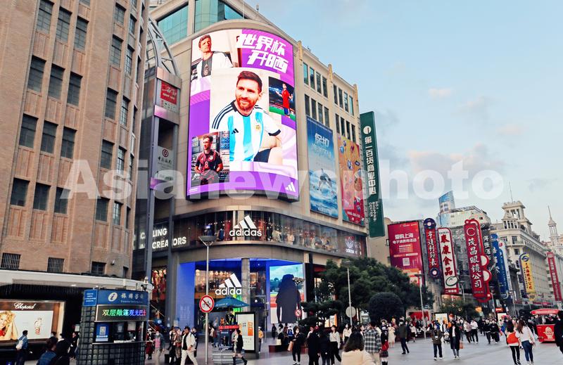 2022年10月29日,上海,卡塔尔世界杯官方球衣和足球亮相阿迪达斯(adidas)南京路步行街旗舰店。图为大屏幕播放阿根廷国家队球星代言人梅西。