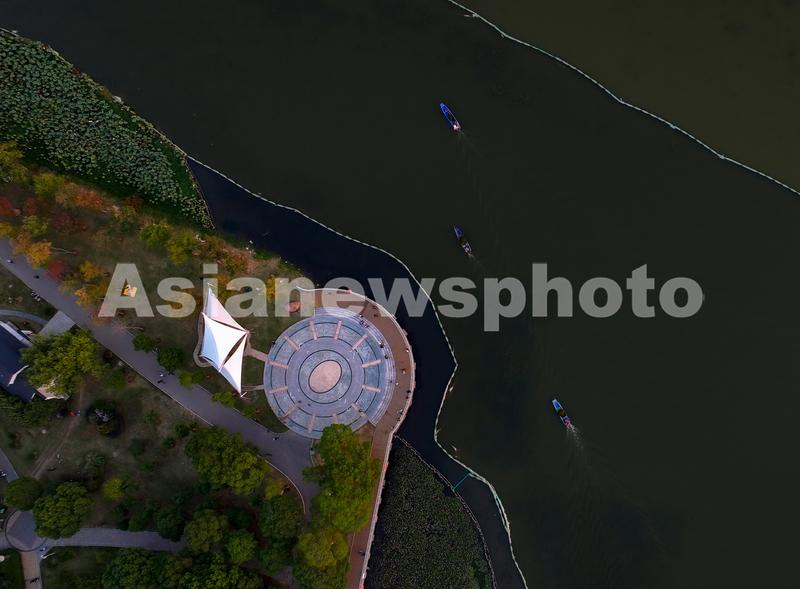 11月2日,工作人员在武汉武昌沙湖湿地公园进行维护作业(无人机照片)。