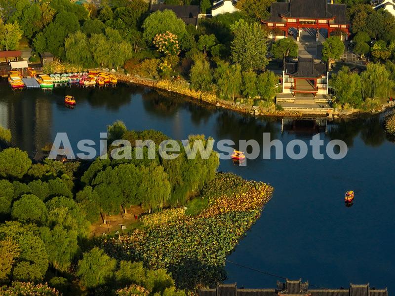 11月2日,游人在武汉武昌沙湖湿地公园乘船欣赏美景(无人机照片)。