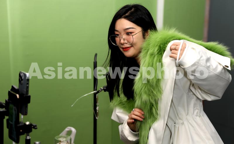 2022年11月3日,浙江省海宁市,海宁中国皮革城时尚潮城电商产业基地经销商“直播电商主播”在推荐皮革皮毛服装。