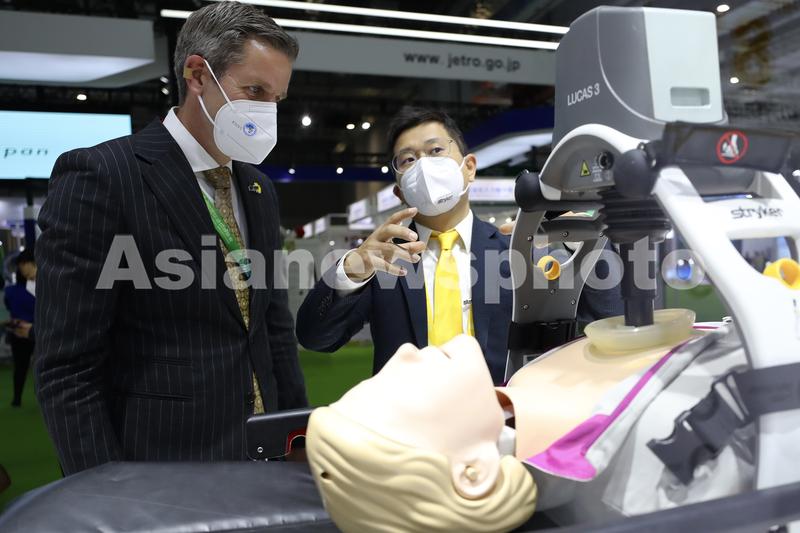 医疗器械及医药保健展区,观众了解一款全自动心肺复苏机的工作原理。