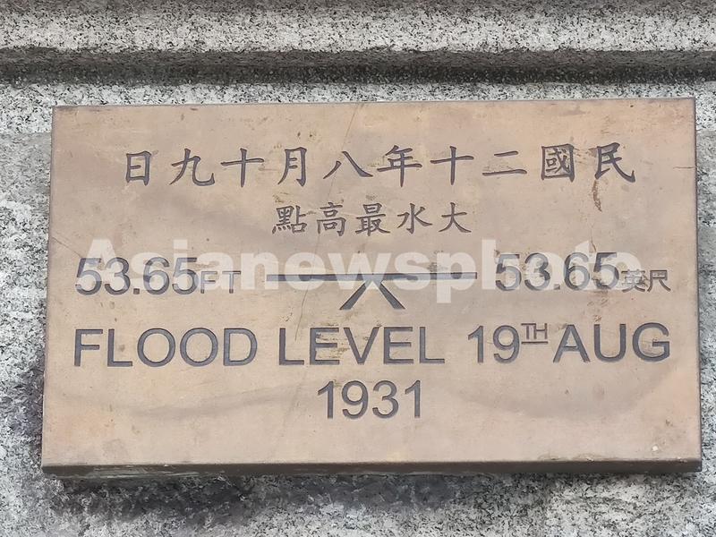 图片说明:11月4日,江汉关大楼外墙上的黄铜铭牌,记载了1931年长江的最高水位线。