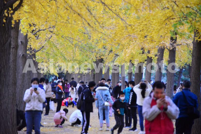 图片说明:2022年11月5日,游人在北京钓鱼台宾馆附近的银杏林里赏秋。