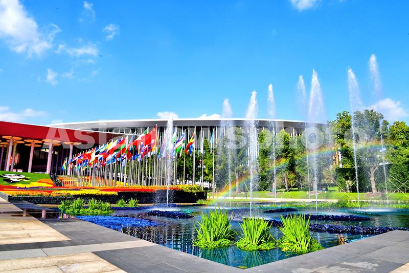 2022年11月8日,上海,国家会展中心南广场彩旗飘扬,鲜花盛开,扮靓进博会。