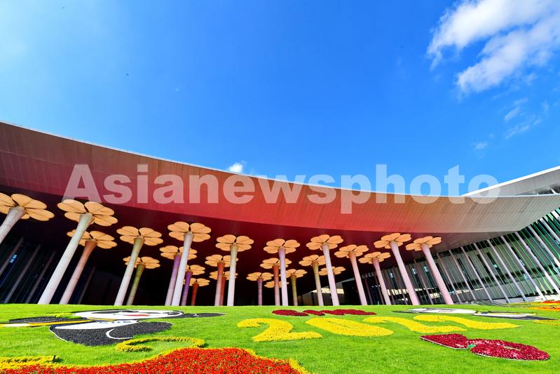 2022年11月8日,上海,国家会展中心南广场彩旗飘扬,鲜花盛开,扮靓进博会。