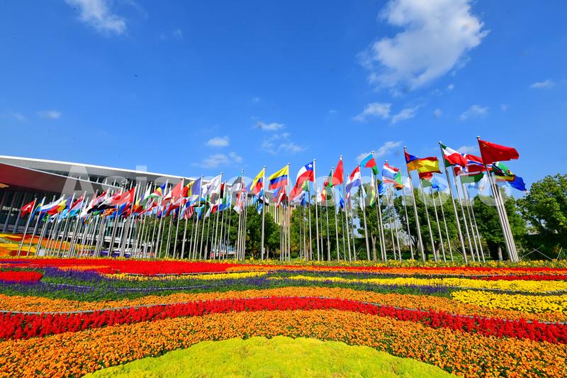 2022年11月8日,上海,国家会展中心南广场彩旗飘扬,鲜花盛开,扮靓进博会。