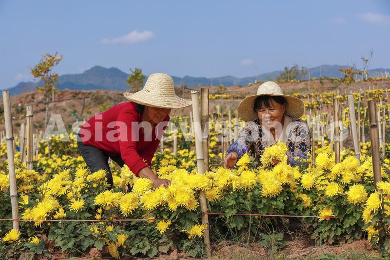 图片说明:2022年11月11日,菊农在安徽黄山市徽州区潜口镇采摘金丝皇菊。