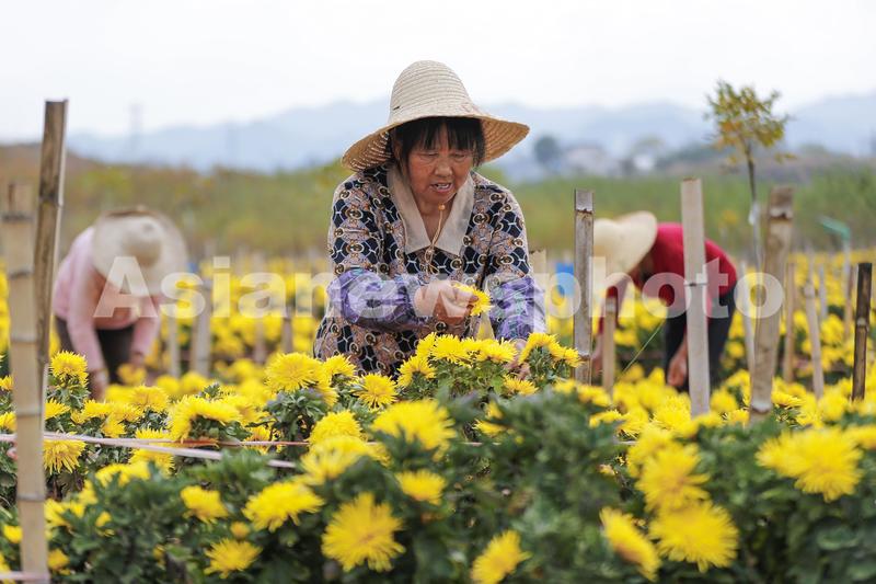 图片说明:2022年11月11日,菊农在安徽黄山市徽州区潜口镇采摘金丝皇菊。