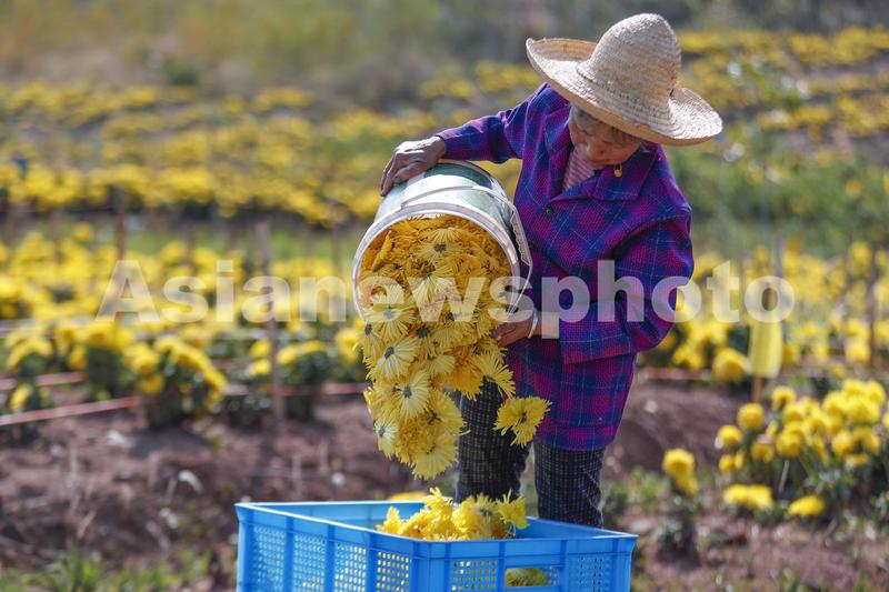 图片说明:2022年11月11日,菊农在安徽黄山市徽州区潜口镇采摘金丝皇菊。