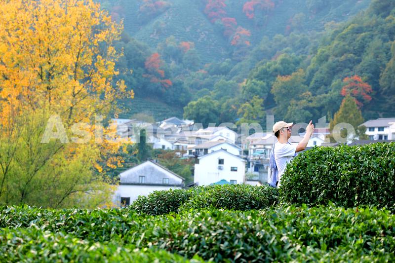图片说明:2022年11月12日,游客在浙江省杭州市西湖区古村落龙井村初冬高山生态茶园游览。