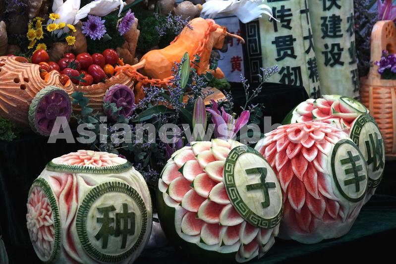 11月12日,在广西一家现代农业科技公司的展台拍摄的用果蔬雕刻的作品。