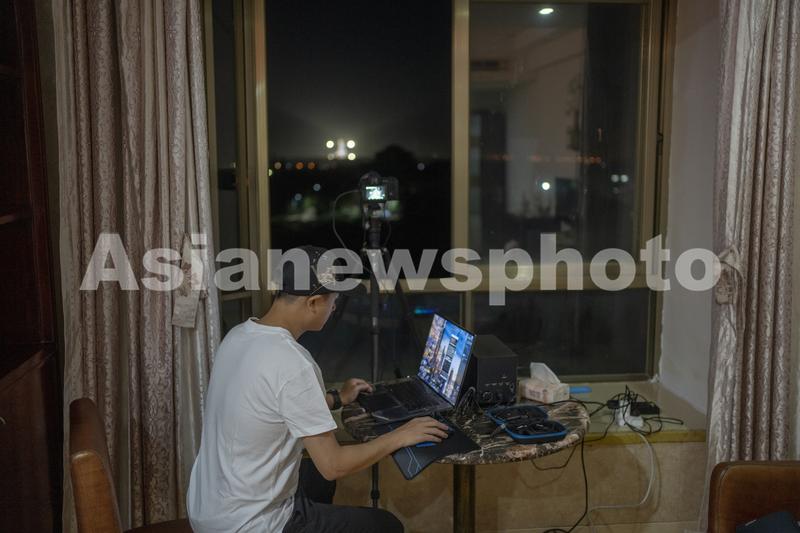 图片说明:2022年11月12日凌晨5时许,海南文昌龙楼镇一酒店,罗弘扬在房间内查看相机的自动拍摄设置,这台相机完整的记录正面机位发射架的全过程。
