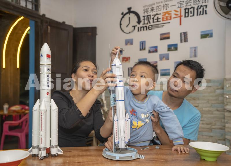 图片说明:2022年11月8日,海南省文昌市龙楼镇,林玉妹(左)和丈夫在自家甜品店陪孩子拼火箭模型。林玉妹是土生土长的文昌龙楼人,在海口、定安等地做过生意。2019年,她和丈夫一起回乡开起了甜品店,受到来自全国各地游客的青睐。