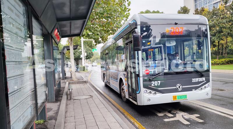 图片说明:11月16日,武汉207路新能源公交车行驶在汉口发展大道上。