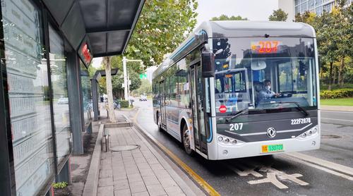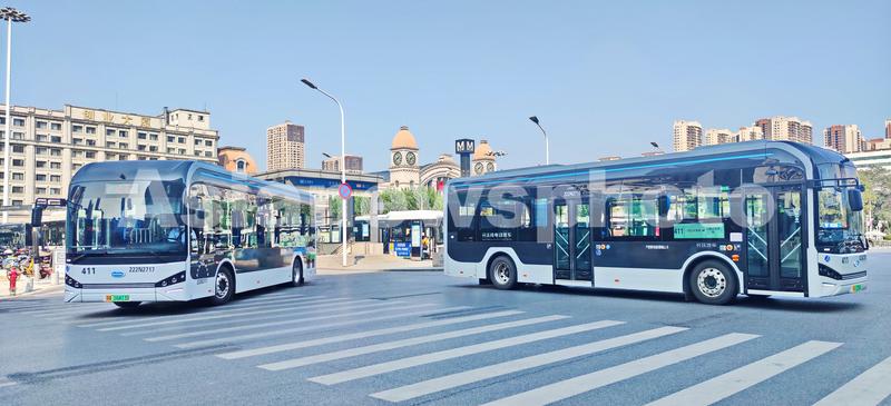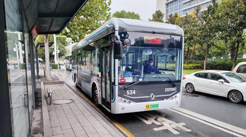 图片说明:11月10日,武汉411路新能源公交车行驶在汉口火车站站前公交站旁。
