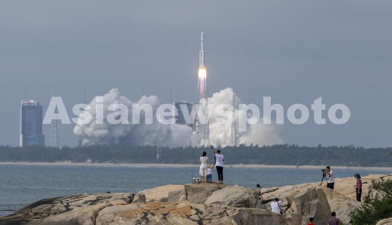 大四学生平磊和陈俊杰在一旁拍摄关于追火箭的青年的毕业作品。当天,长征七号遥六运载火箭在文昌将天舟五号货运飞船托举升空,全国各地的航天爱好者追寻着火箭的脚步齐聚在这个“航天小镇”。
