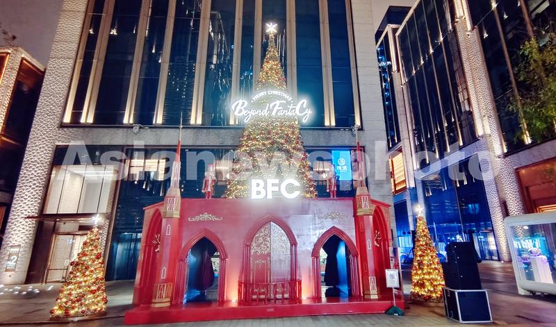 图片说明:2022年11月13日,上海,BFC外滩金融中心的枫径夜市提前营造圣诞集市氛围,高大浪漫的圣诞树和胡桃夹子玩偶城堡在夜晚亮灯。