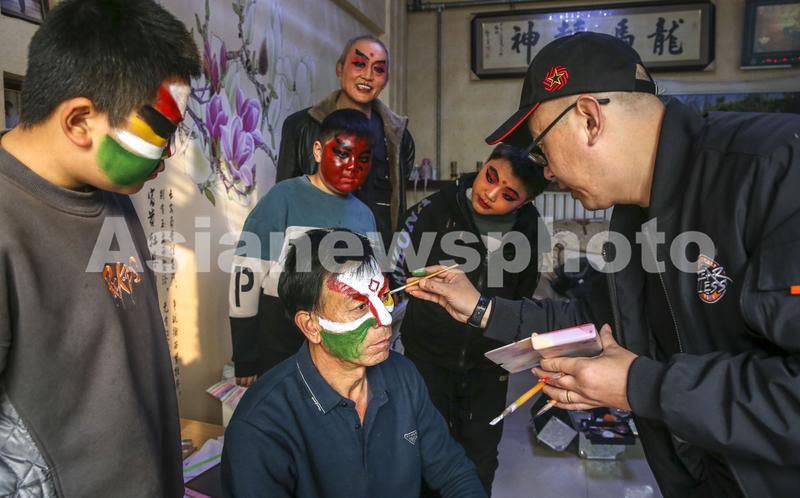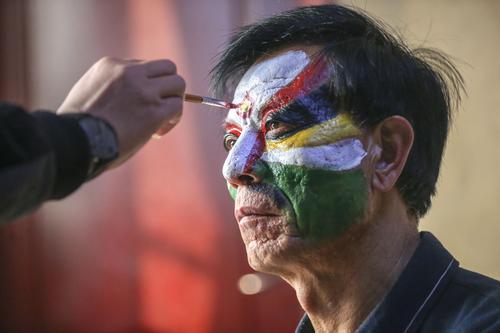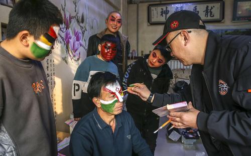 图片说明:2022年11月19日,山西省运城市稷山县非遗传承人员正在给演员化妆。