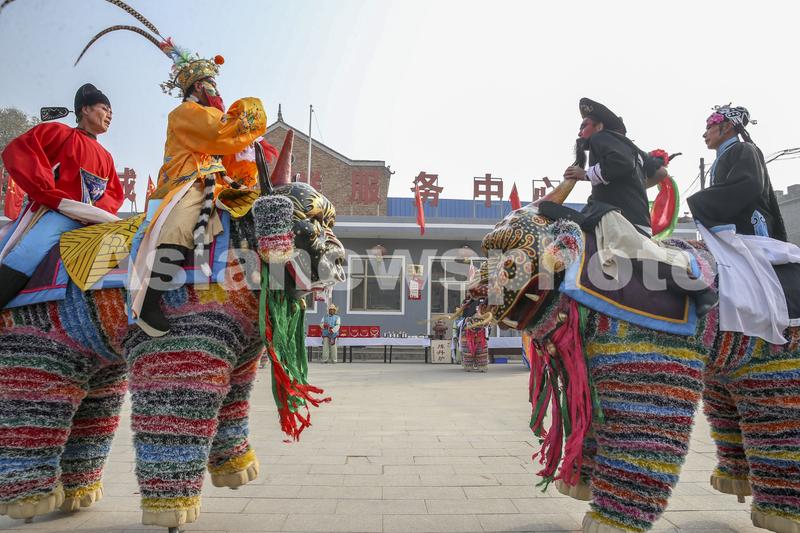图片说明:2022年11月19日,山西省运城市稷山县国家级非物质文化遗产高跷走兽正在表演。