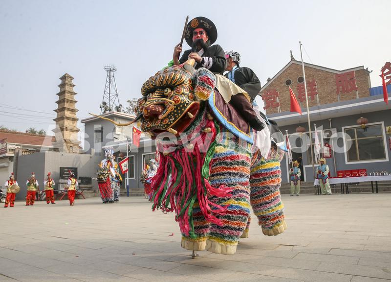 图片说明:2022年11月19日,山西省运城市稷山县国家级非物质文化遗产高跷走兽正在表演。