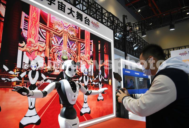 盈乾家智能科技(武汉)有限公司展示的四元一体宇宙大舞台(真实人、机器人、虚拟人、数字人)。