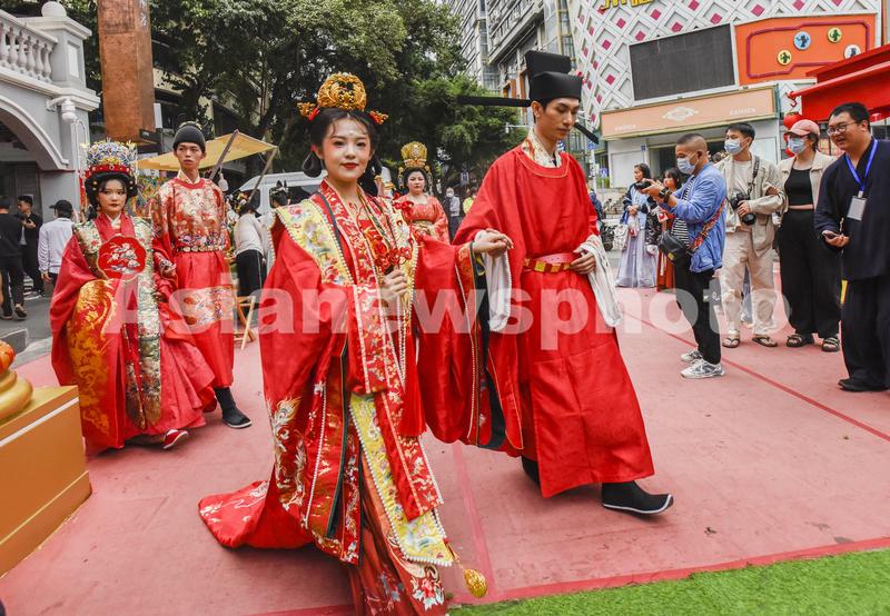 2022年11月19日, 广西南宁一汉服团队在老南宁的三街两巷举办邀您一起参与汉服出行日活动。众多汉服爱好者聚集在仓西门及三街两巷,举行汉服巡游、汉服朝代秀、汉婚秀、甲胄秀等活动,与市民一起感受传统服饰的魅力。