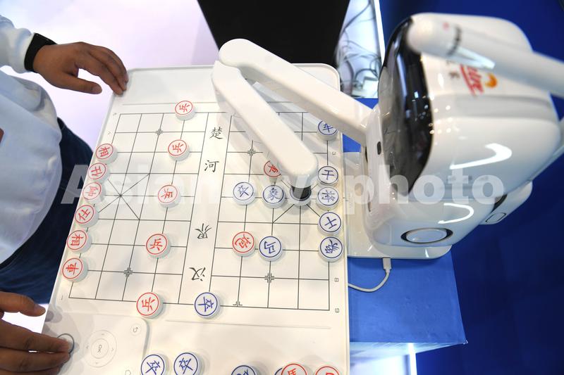 盈乾家智能科技(武汉)有限公司展厅,观众与机器人在下中国象棋。