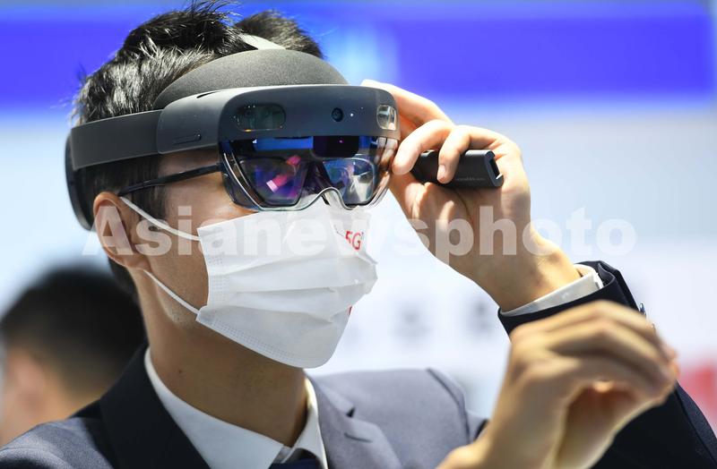 观众在中国联通展厅体验AR眼镜进行发动机远程检修。