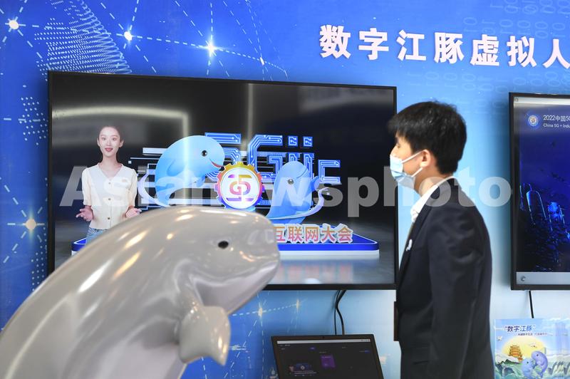 观众在武汉云展厅观看数字江豚虚拟人展示。