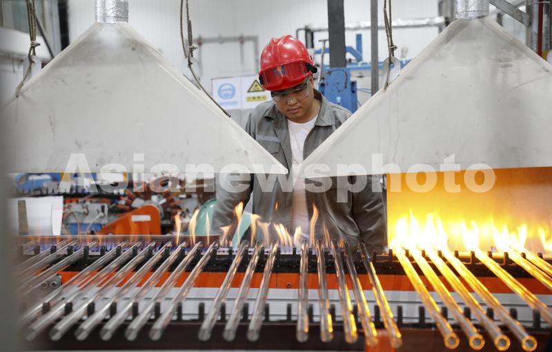 11月22日,在湖南省资兴经济开发区的旗滨医药材料科技有限公司,工人在中性硼硅药用玻璃素管生产线上作业。