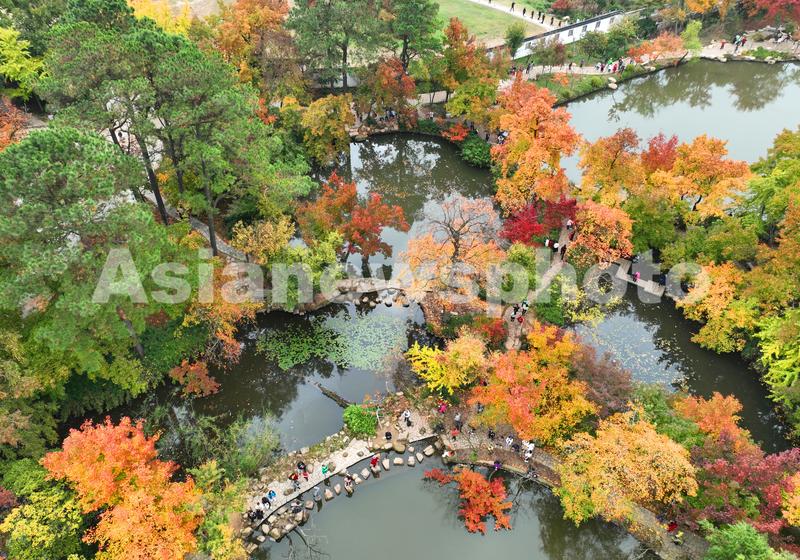 11月23日,无人机拍摄的游人在枫叶绯红的苏州市天平山景区游览。